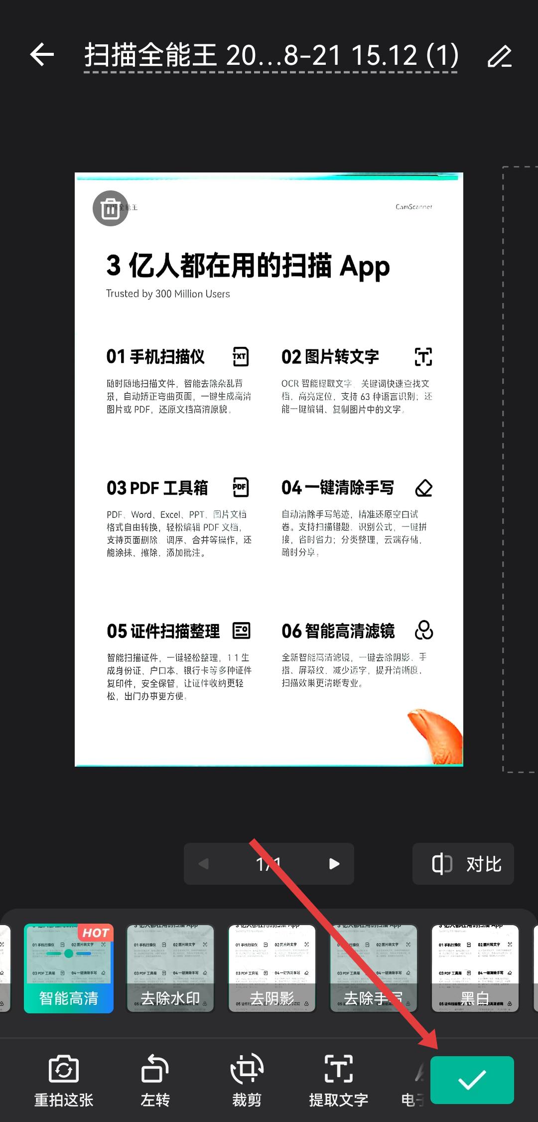 2、拍摄完成后进入图片编辑的页面,可以选择智能高清、去阴影等优化效果,调整后点击右下角绿色对勾确认扫描。