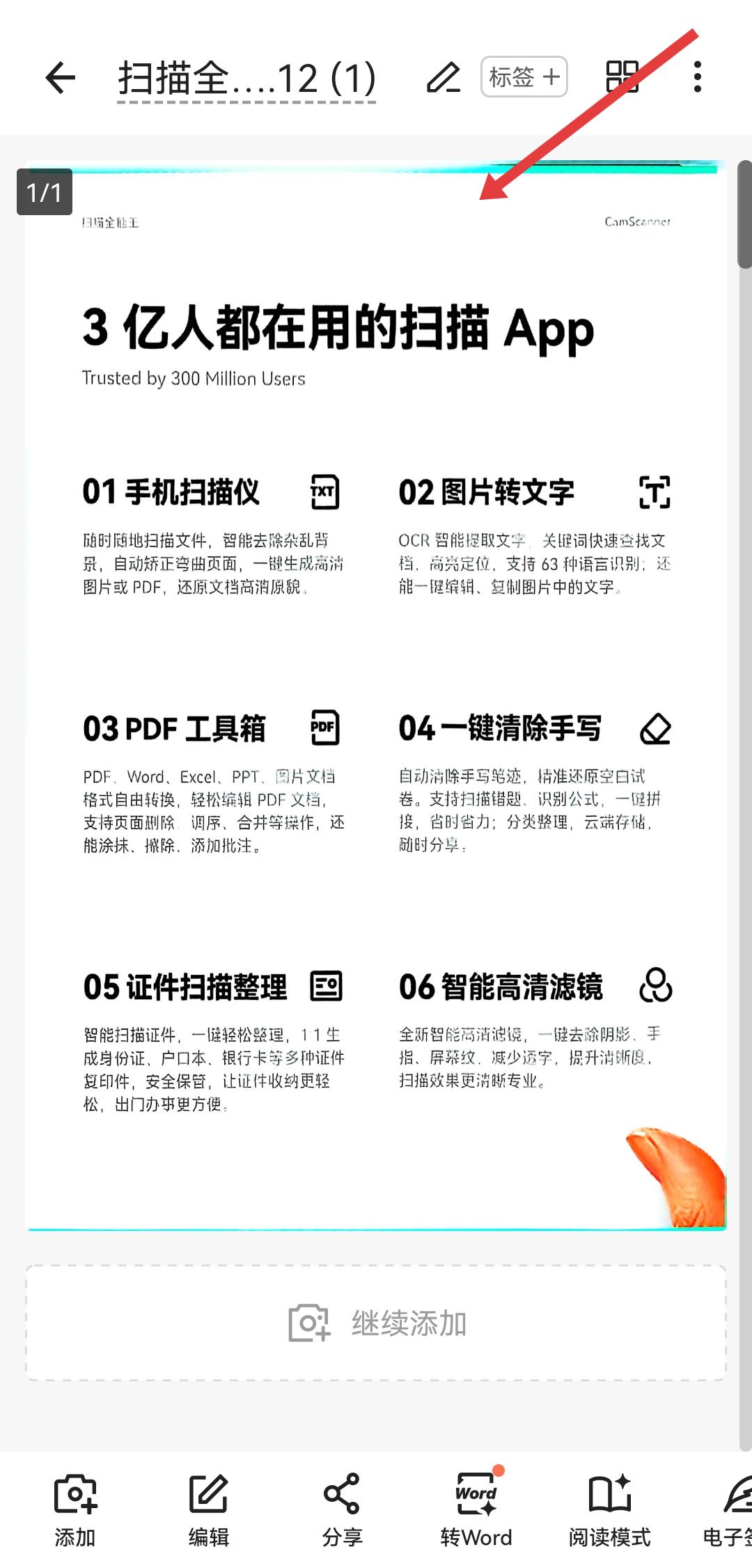 3、确认后生成电子版文档,可以点击底部分享、转Word等功能,将电子版保存至手机或分享给他人。