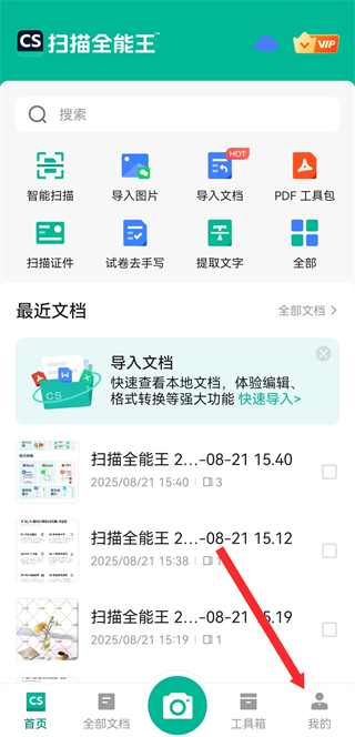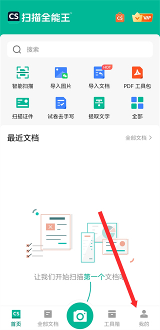 1、打开扫描全能王APP,需要点击底部我的按钮,进入个人的页面。