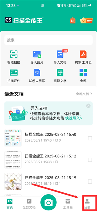 1、打开扫描全能王APP,点击右下角我的,进入个人页面。