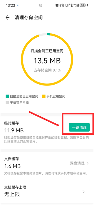 4、在清理存储空间页面中,找到一键清理按钮并点击,完成清除操作。