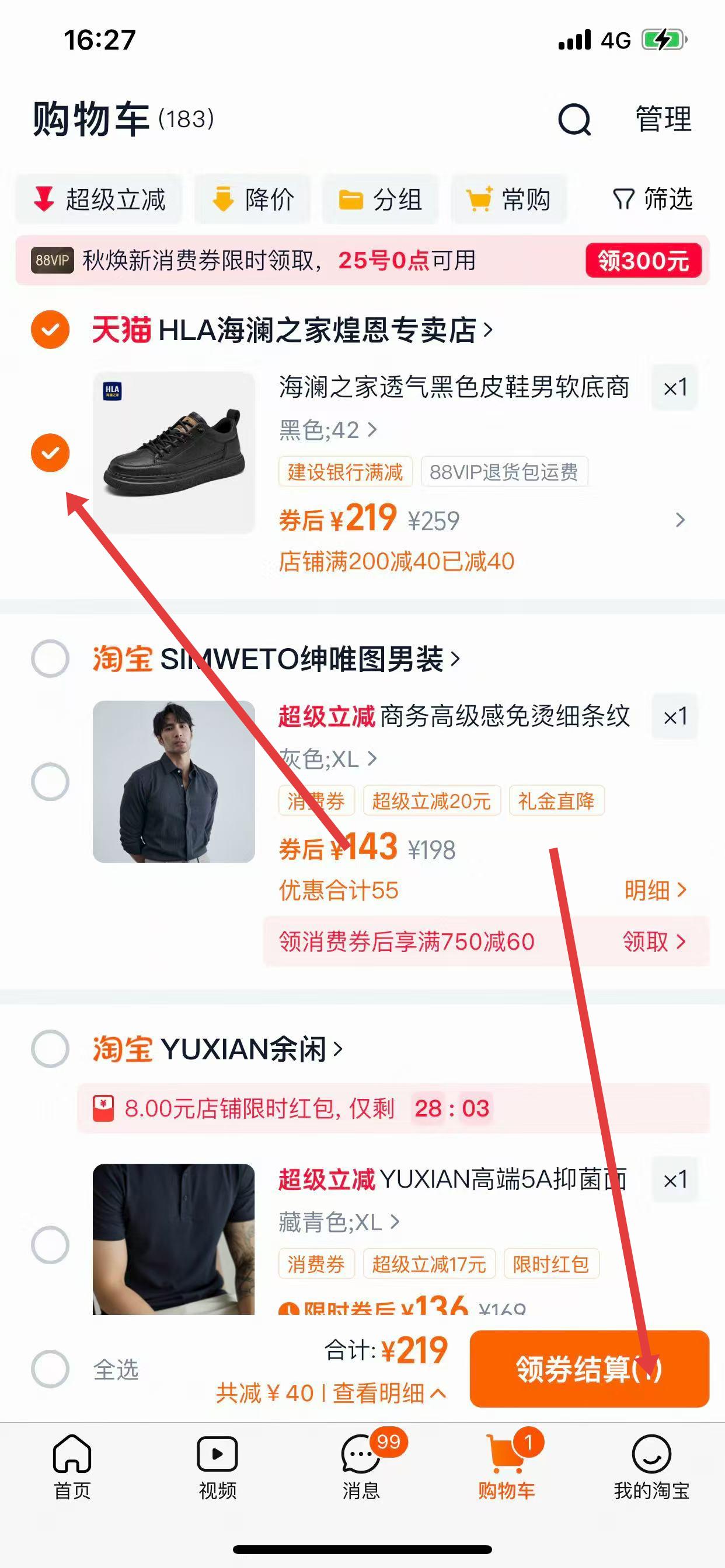 1、打开淘宝APP,点击底部「购物车」,进入购物车页面后,勾选想要购买的商品,点击「领券结算」或「结算」。