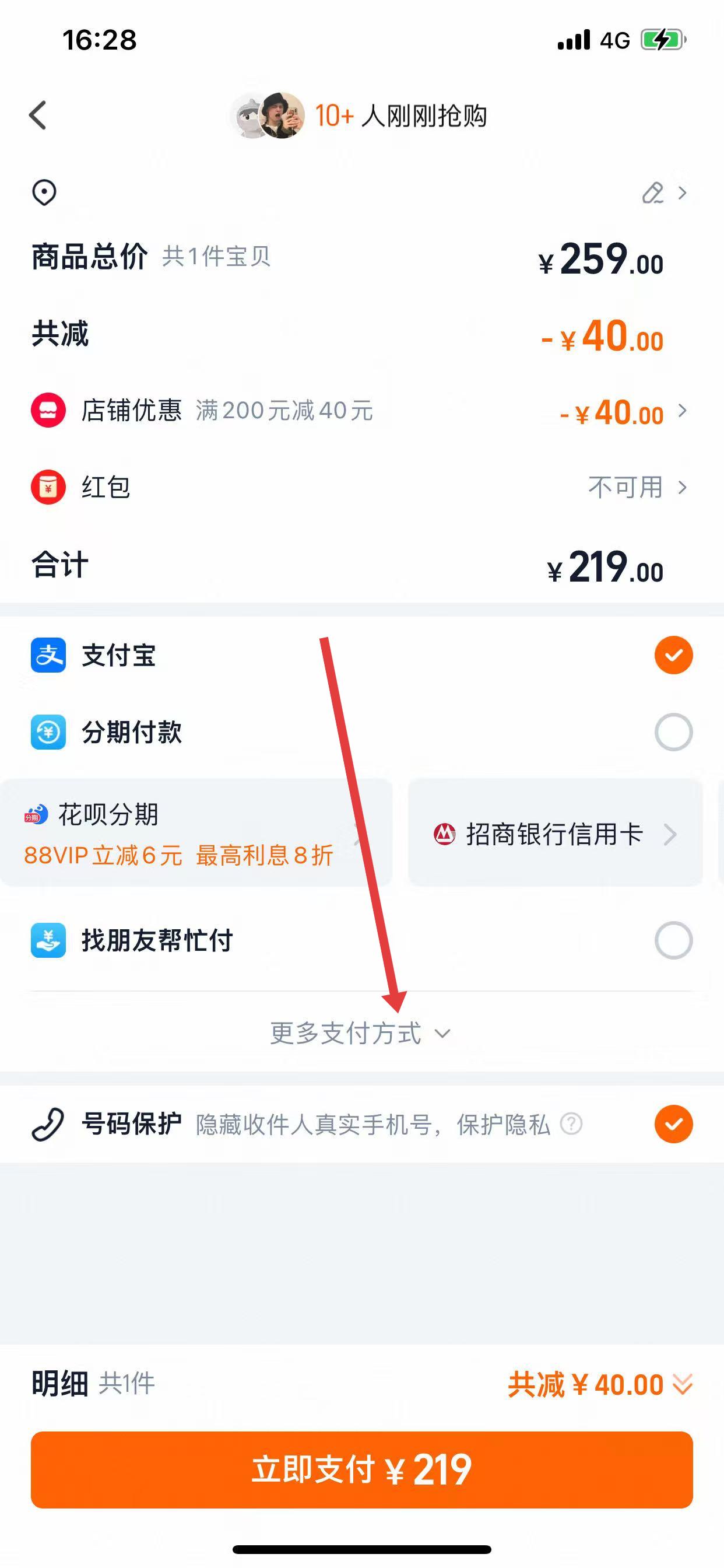 2、在订单确认页面,确认收货地址、商品信息无误后,点击支付方式区域的「更多支付方式」。