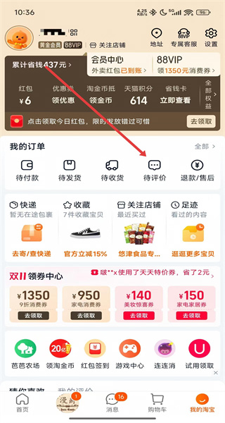 2、在个人页面中,点击待评价选项,进入评价管理页面。