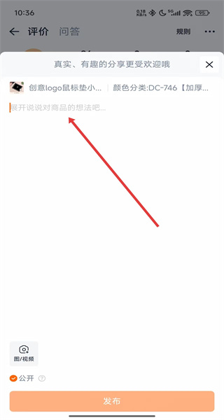 4、进入追评编辑页面,在输入框中填写对商品的评价内容,最后点击发布,完成商品追评操作。