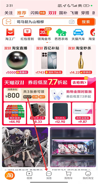 1、在淘宝首页中,可以点击底部消息按钮,进入查看。