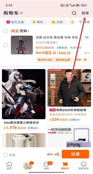 2、在进入到购物车中,可以点击右上方管理按钮,进行管理操作。