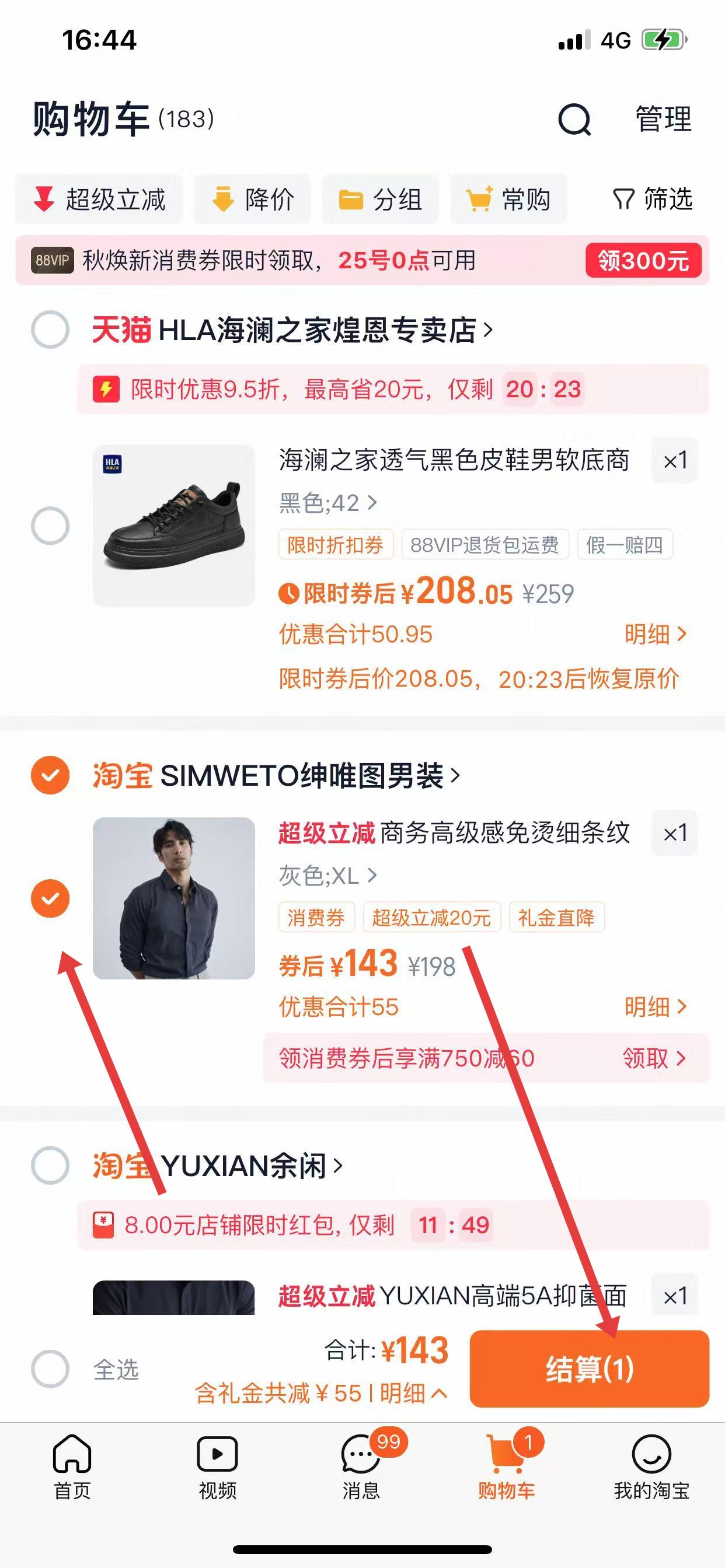1、打开淘宝APP,点击底部导航栏中的「购物车」,进入购物车页面,勾选需要购买的商品,点击右下角的「结算」按钮。
