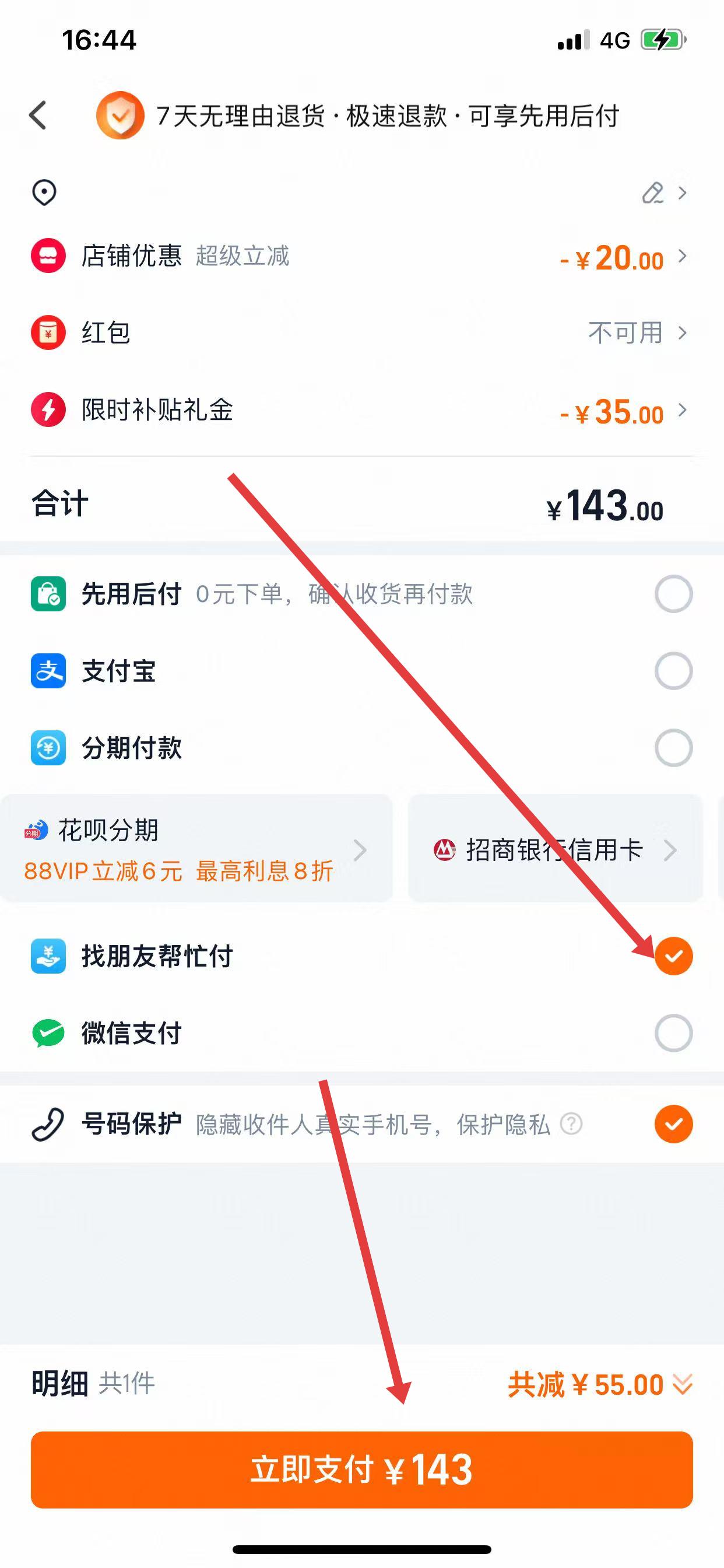2、在订单确认页面,核对收货地址、商品信息等无误后,下滑找到支付方式区域,点击「找朋友帮忙付」选项。
