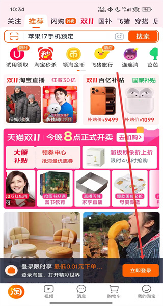 1、在进入到淘宝首页中,可以点击下方立即登录按钮,进行登录操作。