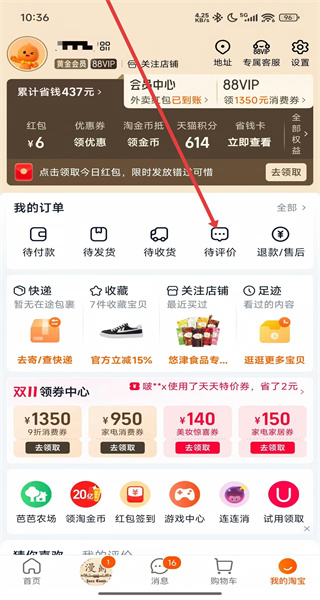 2、在登录完成后点击我的淘宝按钮,进入到个人中心,可以找到点击待评价选项,进入查看评价。