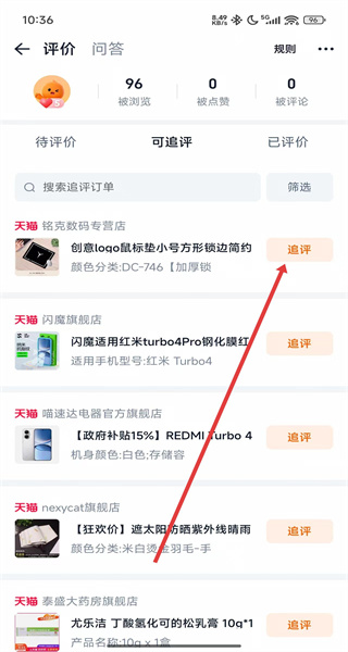 3、在进入到评价管理页面中,可以点击下方商品右侧的追评按钮,进行追加评论。