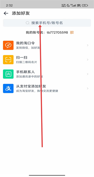 3、在添加好友页面中,可以点击扫上方搜索栏进行搜索好友账号添加。