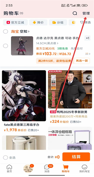 2、在进入到购物车页面后,可以点击右上角管理按钮,进行管理购物车。