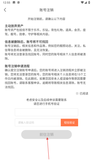4、按照页面提示,完成手机号验证,然后点击前往注销,即可提交账号注销申请。