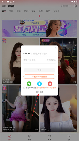2、若未登录,界面会弹出登录方式,点击账号登录的按钮。