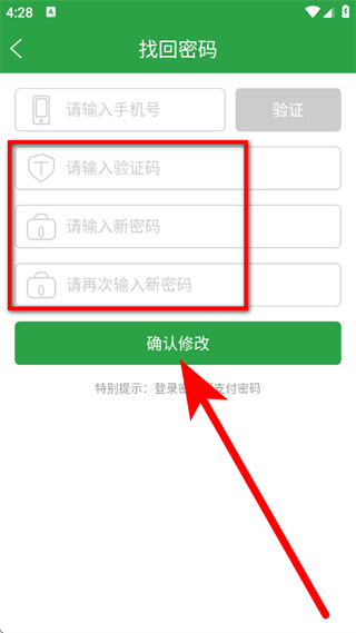 3、输入验证码,输入新密码,点击确认修改,完成密码找回操作。