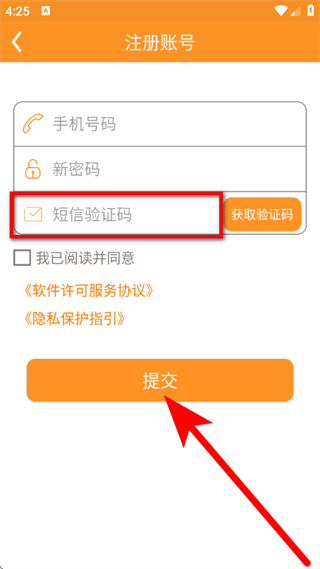 4、在输入框,输入短信验证码,勾选协议后,点击提交,完成账号注册。