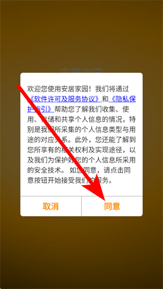 1、打开安居家园,在欢迎提示框中,点击同意,进入登录页面。