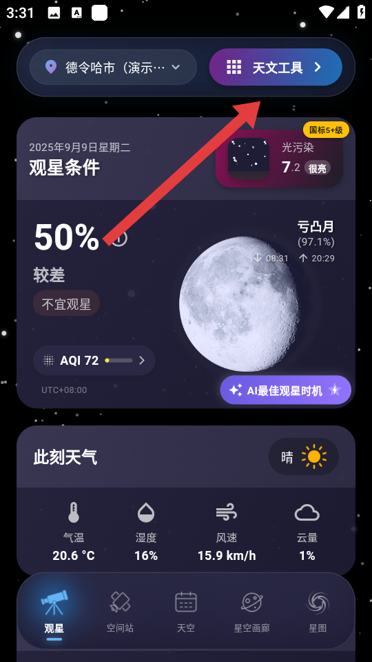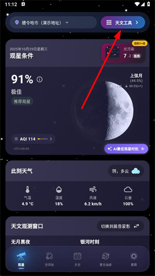 1、在天文通app观星页面点击天文工具选项,进入菜单页面。