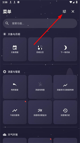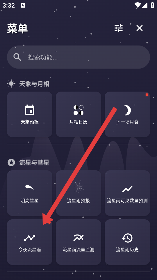 2、在功能菜单的流星与彗星区域,点击今夜流星雨,进入全时段流星预测页面。