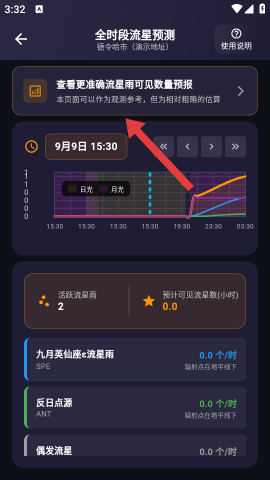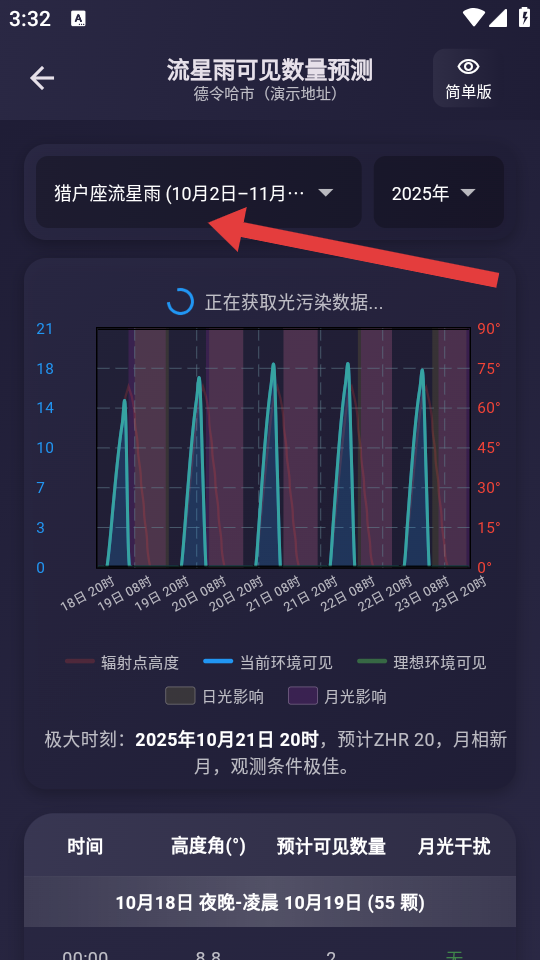 4、在流星雨可见数量预测页面,可通过顶部选项选择流星雨类型,查看该流星雨详细预测。