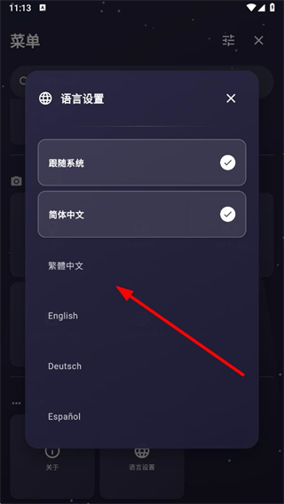 3、语言设置页面展示多项语言,如繁體中文、English、Deutsch、Español等。