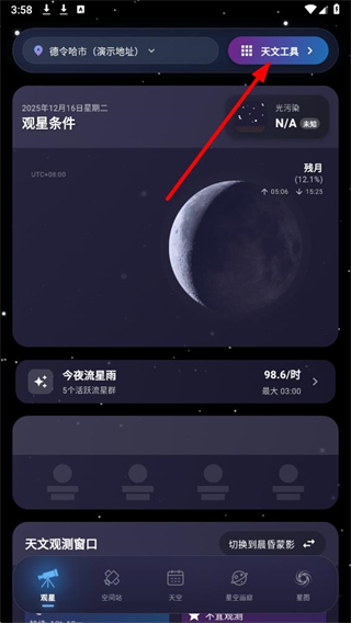 1、在天文通主界面,点击右上角天文工具,进入功能菜单的页面。