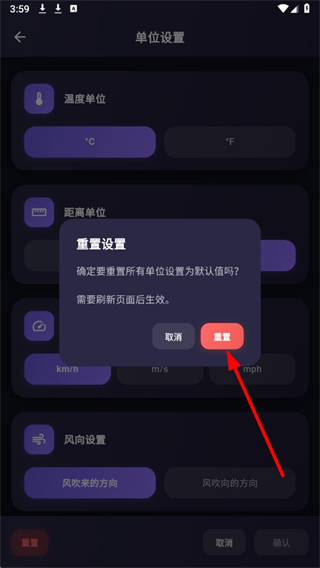 4、在弹出的重置设置确认框中,点击重置按钮,即可将所有单位设置恢复为默认值。