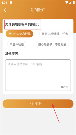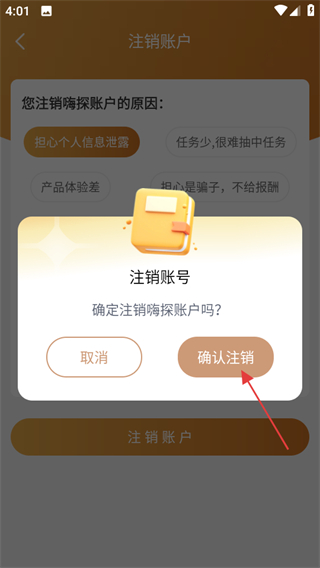 6、在原因页面,选择注销原因后点击注销账户,弹出确认窗口。