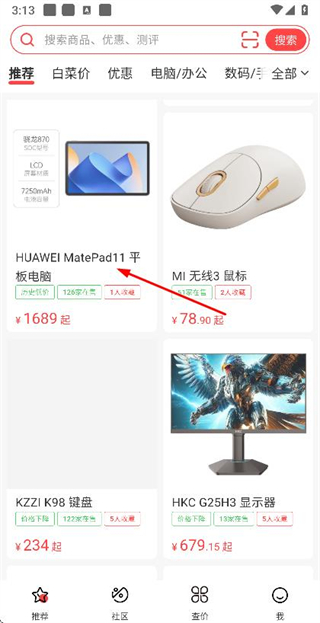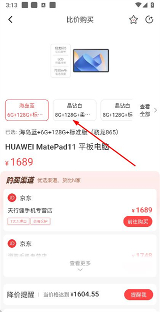 1、在推荐页面点击目标商品,进入比价购买页面。
