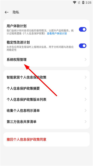 4、在隐私页面,点击系统权限管理选项,即可进入对应的权限管理界面。