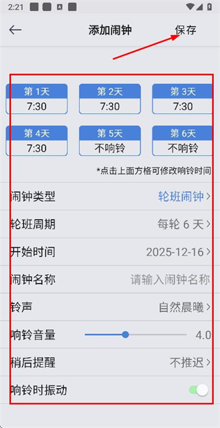 3、在添加闹钟页面完善时间、名称等信息后,点击保存按钮完成轮班闹钟的添加。