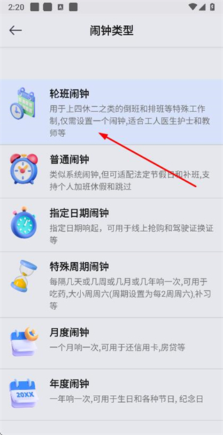 2、在闹钟类型选择页面点击轮班闹钟选项,进入添加轮班闹钟页面。