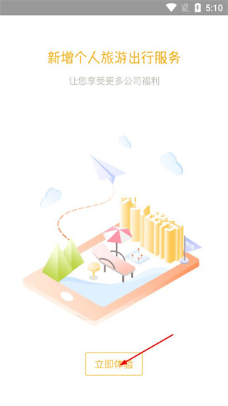 1、打开途途商旅应用,看到新增个人旅游出行服务页面,点击页面中的立即体验按钮,进入登录页面。