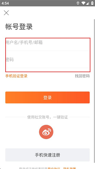 3、进入账号登录页面后,找到用户名/手机号/邮箱输入框,填写对应的信息,再填写密码。