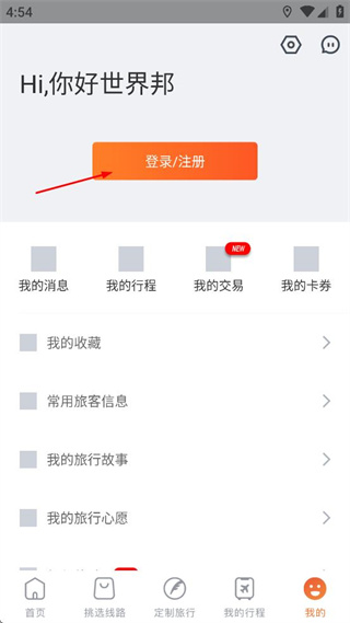 2、在我的页面中,找到橙色的登录/注册按钮,点击该按钮,进入账号登录的操作页面。