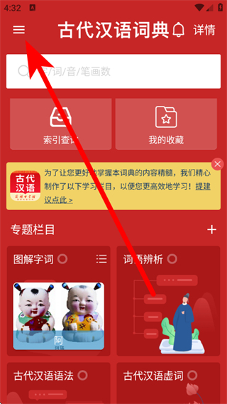 1、打开古代汉语词典,点击首页左上角的横线,进入更多页面。