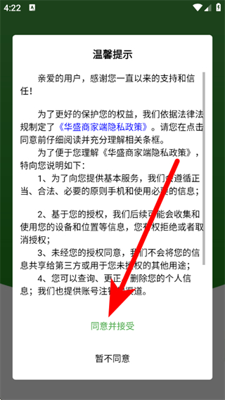 1、打开华盛商家端,点击同意并接受,进入商家登录界面。