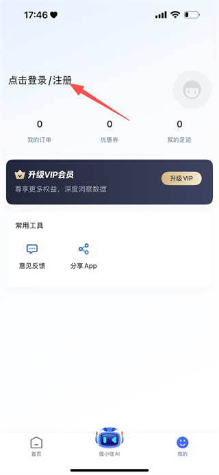 2、在个人页面中,点击点击登录/注册区域,进入登录选择页面。