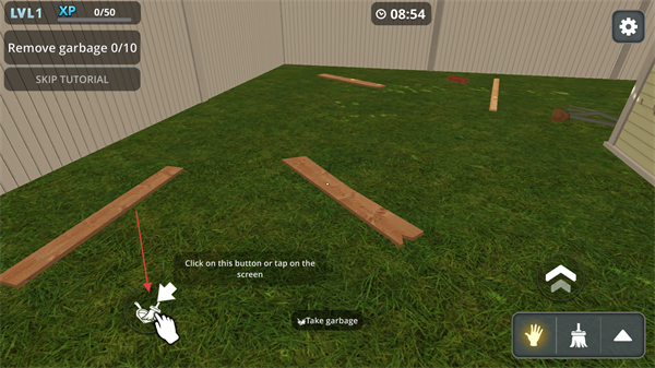 3、界面会显示垃圾清理类任务,点击垃圾本身或左下角的垃圾工具按钮,完成场景内的垃圾清理,推进任务进度。