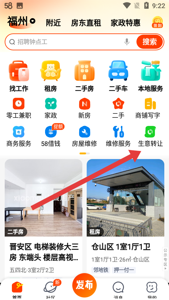 1、打开58同城进入首页后点击生意转让图标,位于功能栏第三行最右侧,进入商铺转让信息的页面。