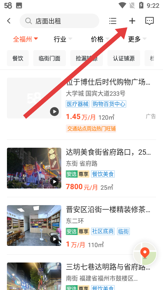 2、在商铺转让的页面,我们需要点击右上角+号按钮,进入商铺信息发布分类的选择界面。