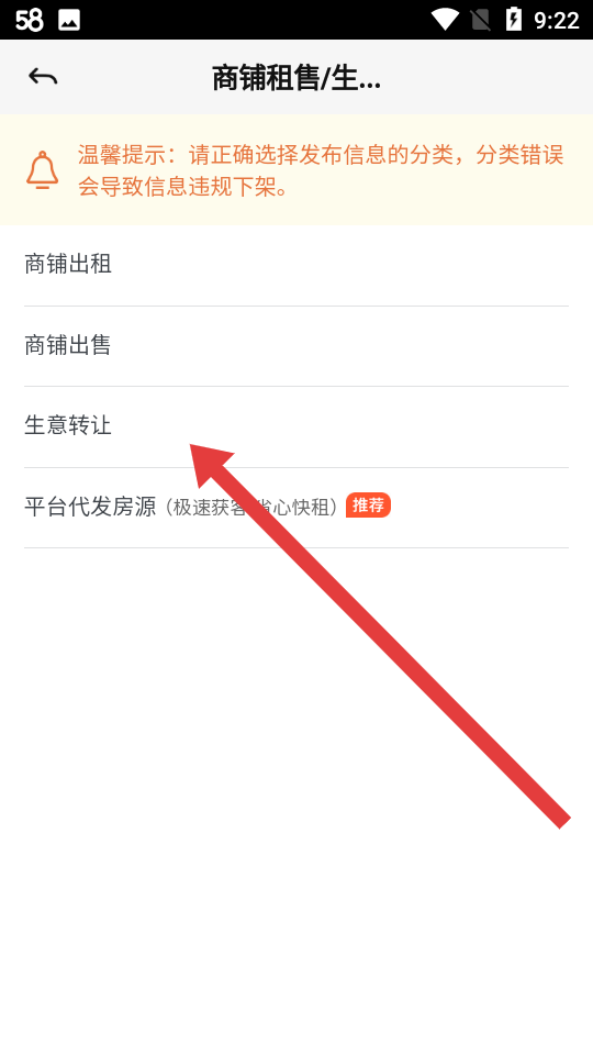 3、在分类列表中,点击生意转让选项,进入信息填写页面,后续依次填写信息,等待审核通过即可发布广告。