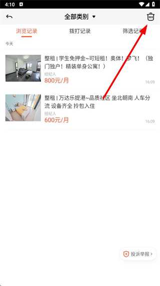 3、进入浏览记录页面后,点击右上角的垃圾桶图标,进入选择删除记录的界面。
