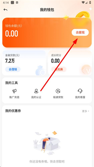 3、在我的钱包页面,点击去提现进入钱包余额页面。