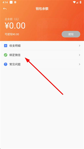 4、在钱包余额页面,点击绑定微信,按照提示操作即可完成微信绑定以用于提现。