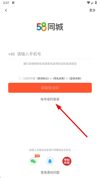 2、在登录选择页面,点击账号密码登录选项,进入账号密码登录界面。