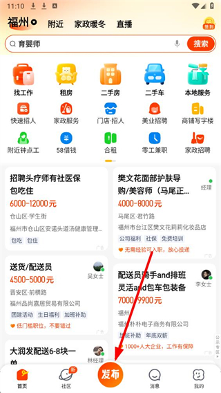 1、在58同城主界面中,点击底部发布按钮,进入发布分类选择页面。