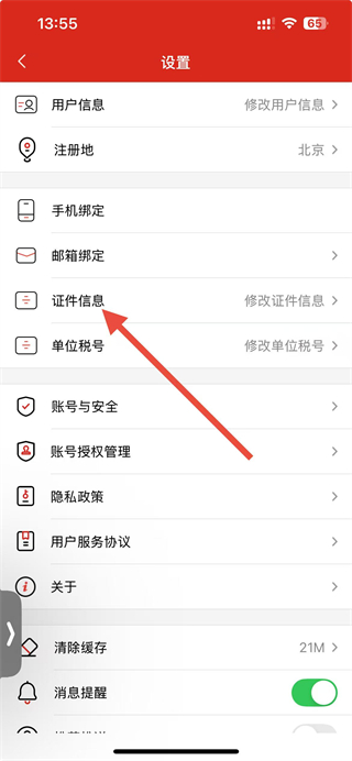 2、在设置页面,点击证件信息选项,进入证件信息的编辑界面,准备修改相关内容。